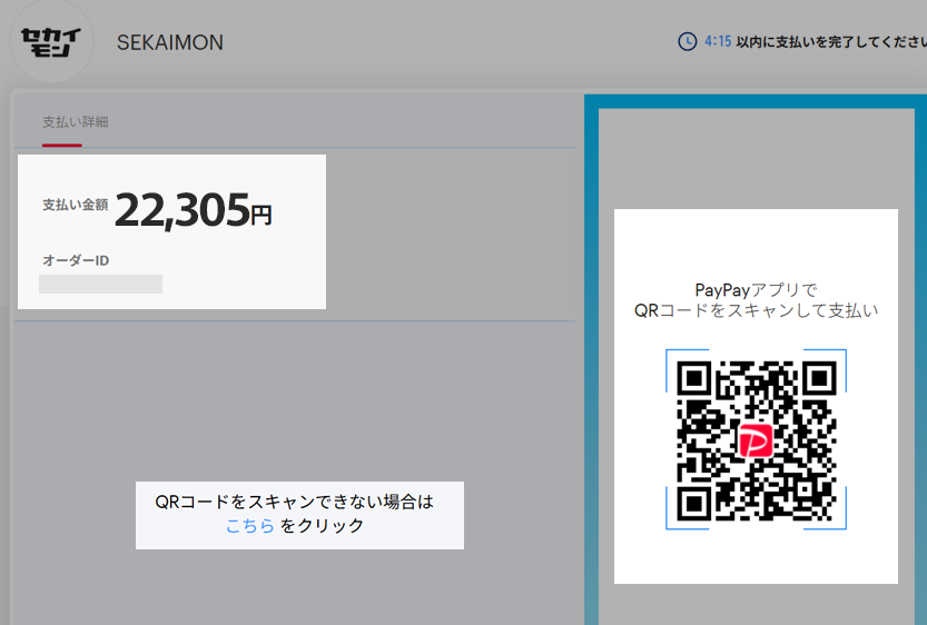 ● PayPay支払用QRコードの有効時間は5分です。時間切れの場合、購入処理は完了していないため、セカイモンでの購入手続きからやり直してください。
