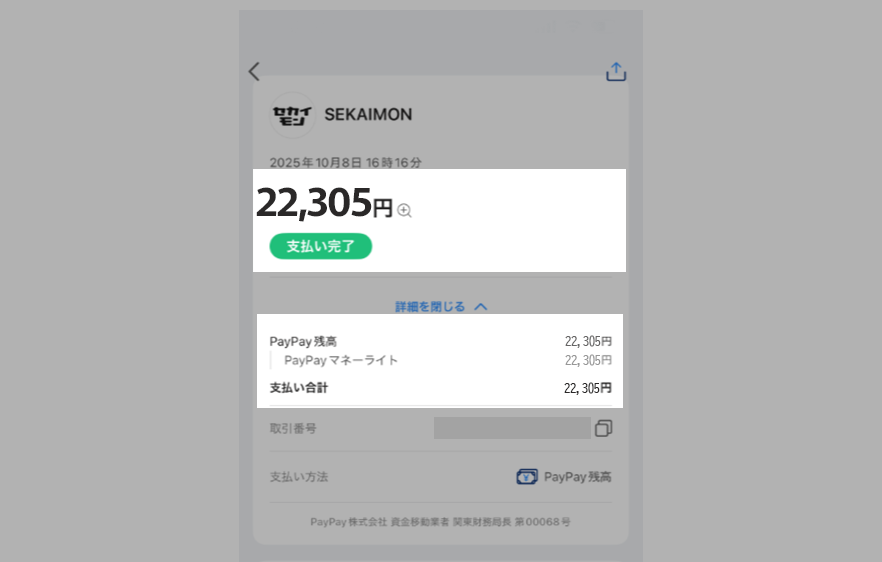 PayPay上で支払いが完了し、セカイモンの購入完了ページに自動で遷移する